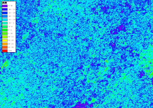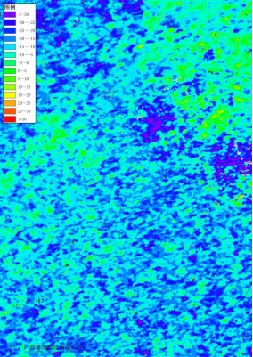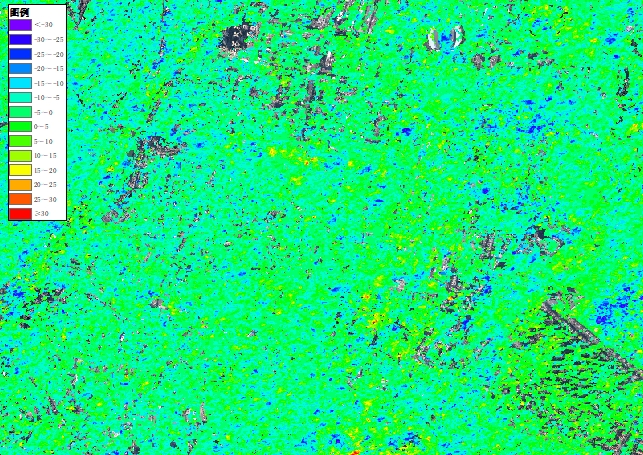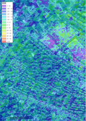 图2为一般软件的形变监测结果,呈现大面积蓝紫色区域,形变信号模糊、整体数据杂乱无章,大量区域数据失真,难以看清真实的地面形变状况。