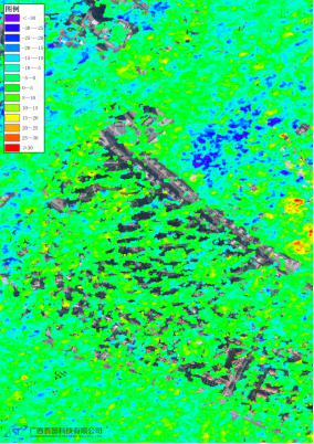 图1为广西善图科技的形变监测成果,整体信号干净规整,大面积绿色区域清晰对应稳定区域的正常形变状态,仅局部的蓝、黄、红色区域,精准呈现了不同程度的形变信号。不仅能有效剔除无效噪点,还原真实的形变分布,更能精准识别建筑、道路等人工地物的边界形变特征,数据真实可靠,如同 “高清镜头”,将地面形变的每一处细节都精准呈现。