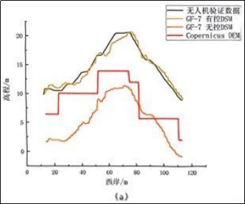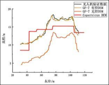 经肇庆西江堤坝区域实际验证,无激光控制的 GF-7 DSM 高程均方根误差为 8.194m,而经善图科技激光高程控制优化后,DSM 高程均方根误差降至0.76m,远优于常用的 Copernicus DEM(5.11m),且能精准提取堤坝相对高度,东岸、西岸堤坝相对高度误差仅 0.33m 和 0.15m(图3)。