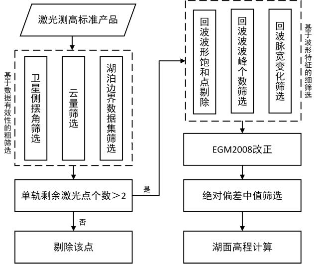湖库水位是水利监测的核心数据,传统水位站实测方式存在建设成本高、覆盖范围有限、突发水患时响应慢等问题,而善图科技依托 GF-7 卫星激光测高技术,构建了多层级湖面激光点筛选体系,通过卫星侧摆角、云量、回波波形特征、脉宽变化等多参数约束(图 1),精准剔除误差激光点,实现湖库水位的高精度提取。