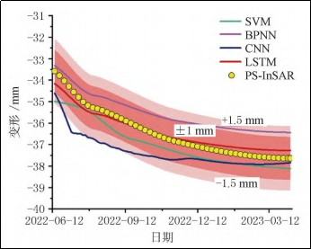 通过误差条带图直观呈现各模型预测效果,LSTM模型预测趋势与PS-InSAR实测趋势高度契合,误差范围远小于其他模型,对沉降速率变化点的捕捉精准度显著优于对比模型。