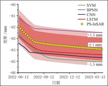 通过误差条带图直观呈现各模型预测效果,LSTM模型预测趋势与PS-InSAR实测趋势高度契合,误差范围远小于其他模型,对沉降速率变化点的捕捉精准度显著优于对比模型。