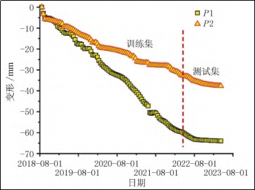 选取研究路段A处P1、B处P2两个特征点开展变形预测,采用makima插值法将原始InSAR变形数据处理为时间间隔3d的等时距数据,共555组数据点;按8:2比例划分为训练集(455组)与测试集(100组),并进行归一化处理提升模型训练效率,数据划分结果如下图6。